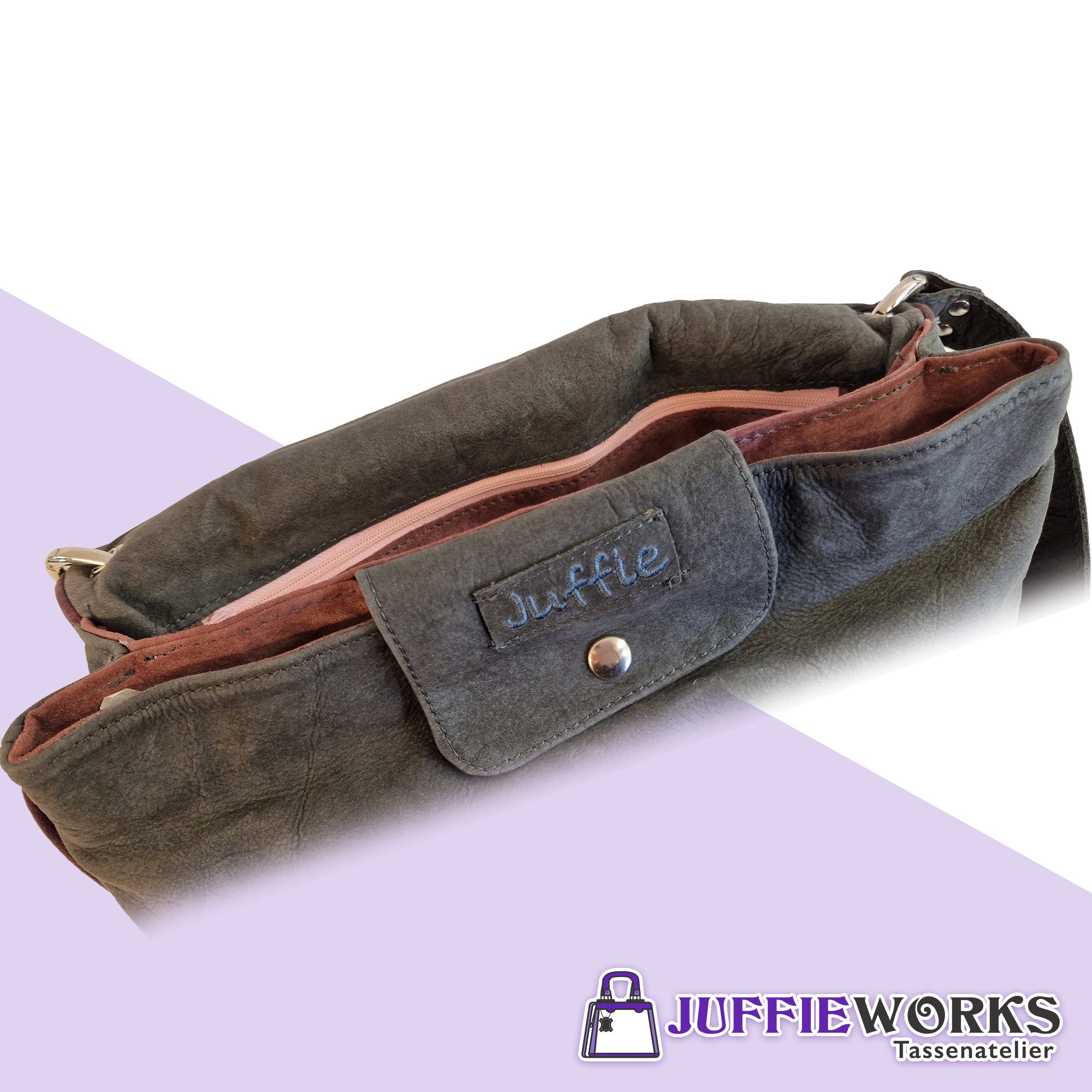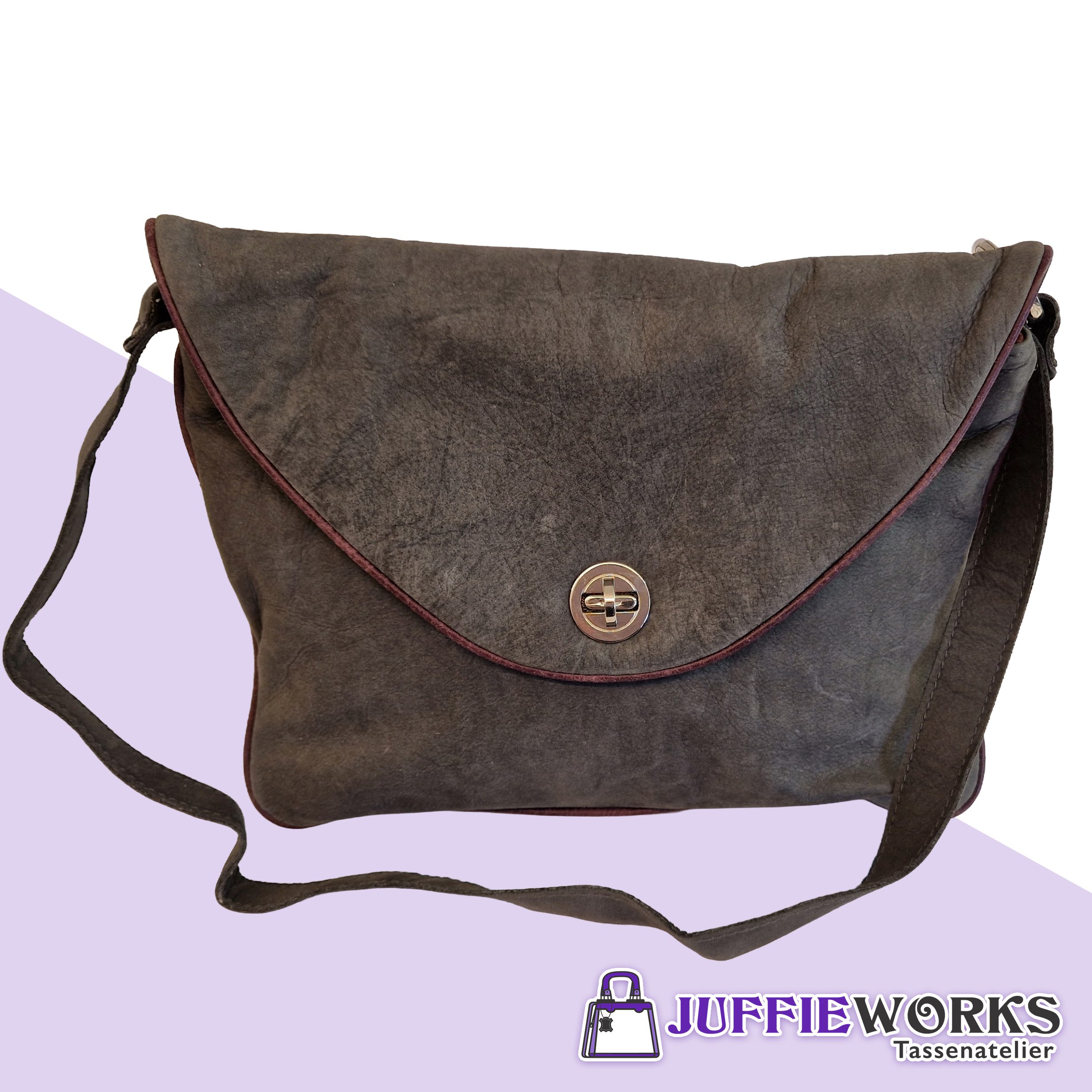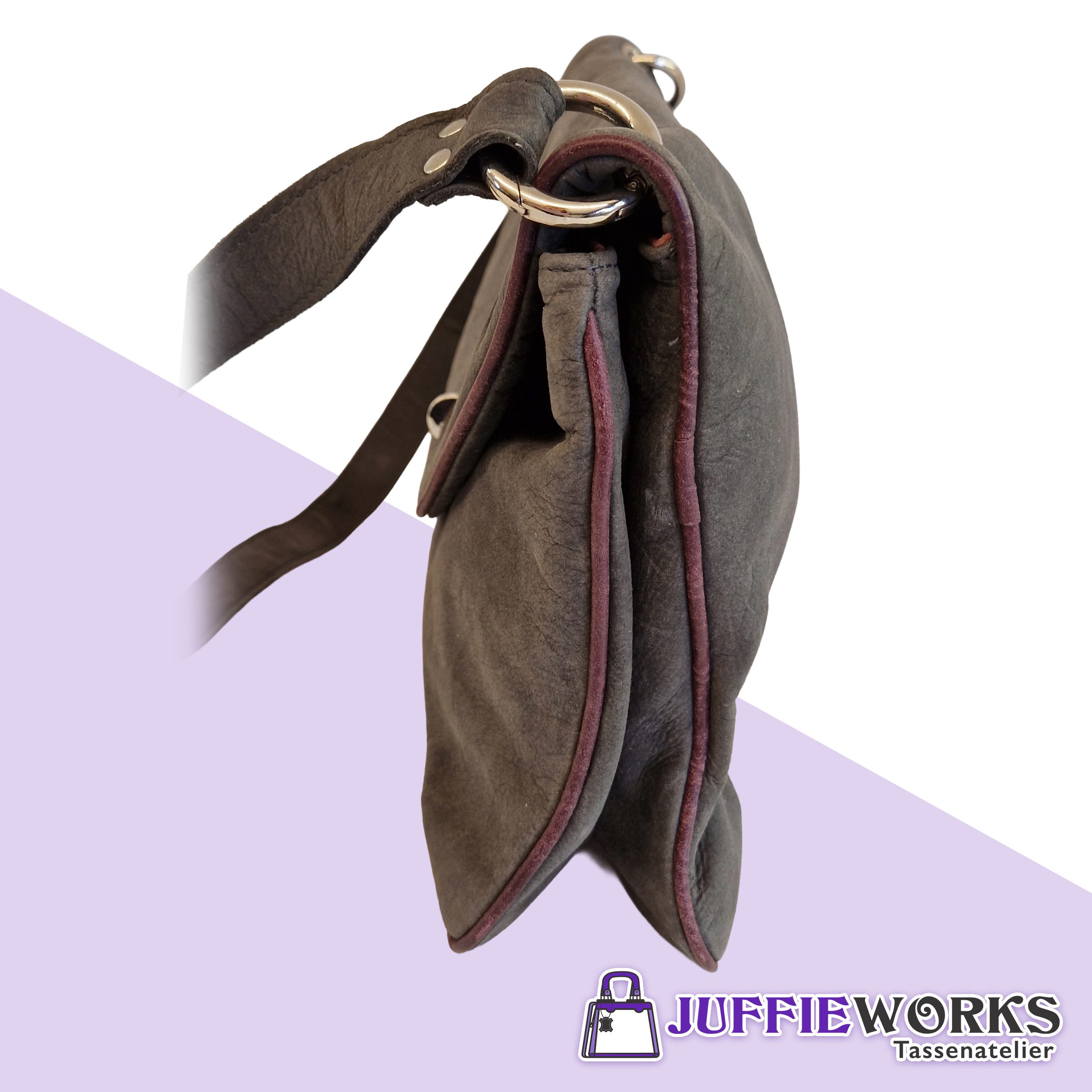 Zwart-grijs enveloptas. afgezet met een paarse piping. De tas is met leder gevoerd en heeft 2 vakken. een kittig hengsel