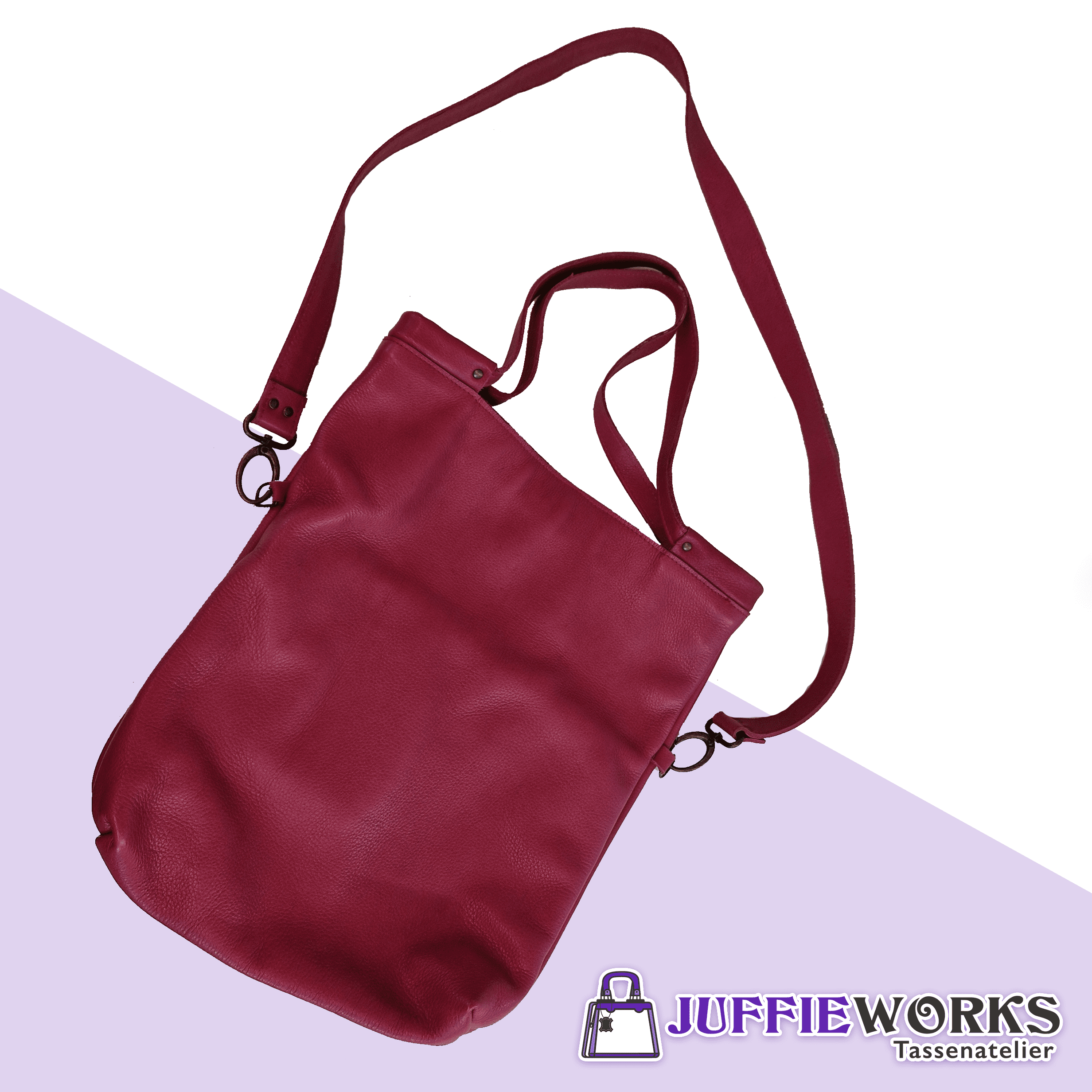 Fuchia kleurige tas van soepel rundsleder. Kort en lang hengsel. Binnenin een zwart leder ruim rits vak.. afm. 30*33*2 cm. sluit met een magneet.